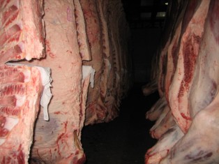 米山食肉公社の協力により市場の冷蔵庫に枝肉(骨付き)で5日間寝かせ